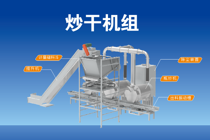 機組組成:本機組由瓶式炒干機、計量儲料斗、提升機、出料振動槽、除塵裝置、機組集成控制系統(tǒng)組成。